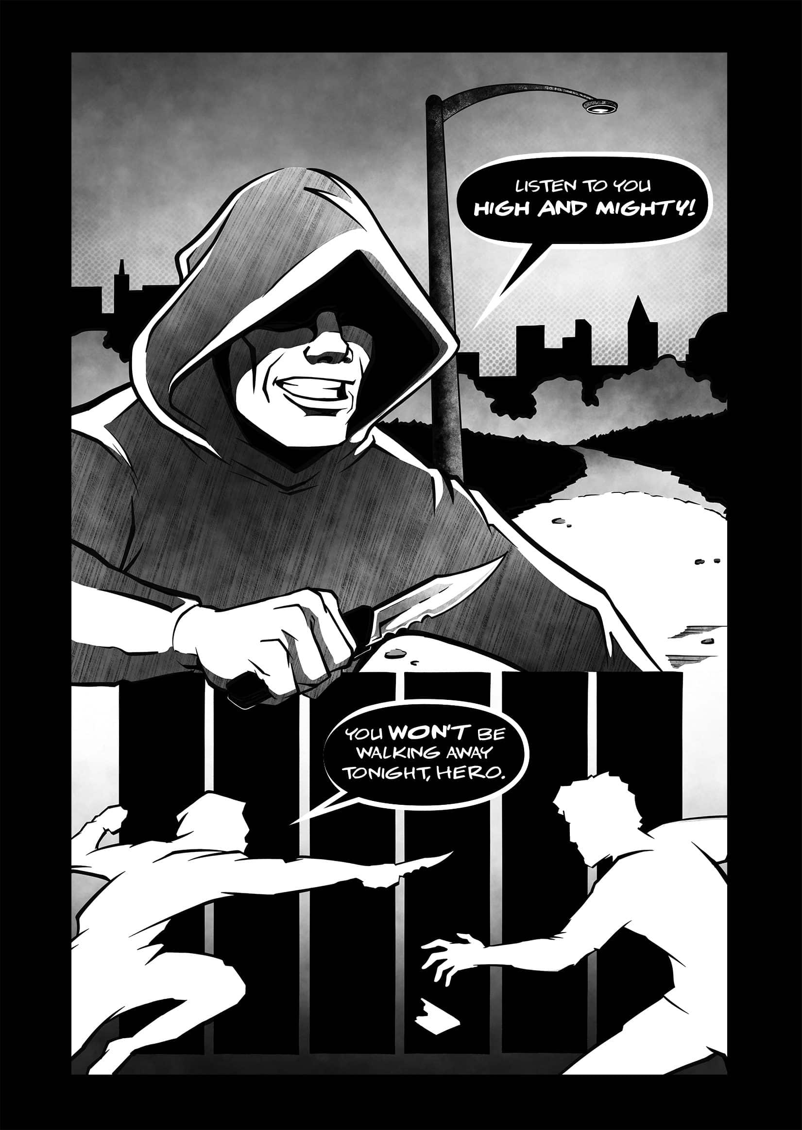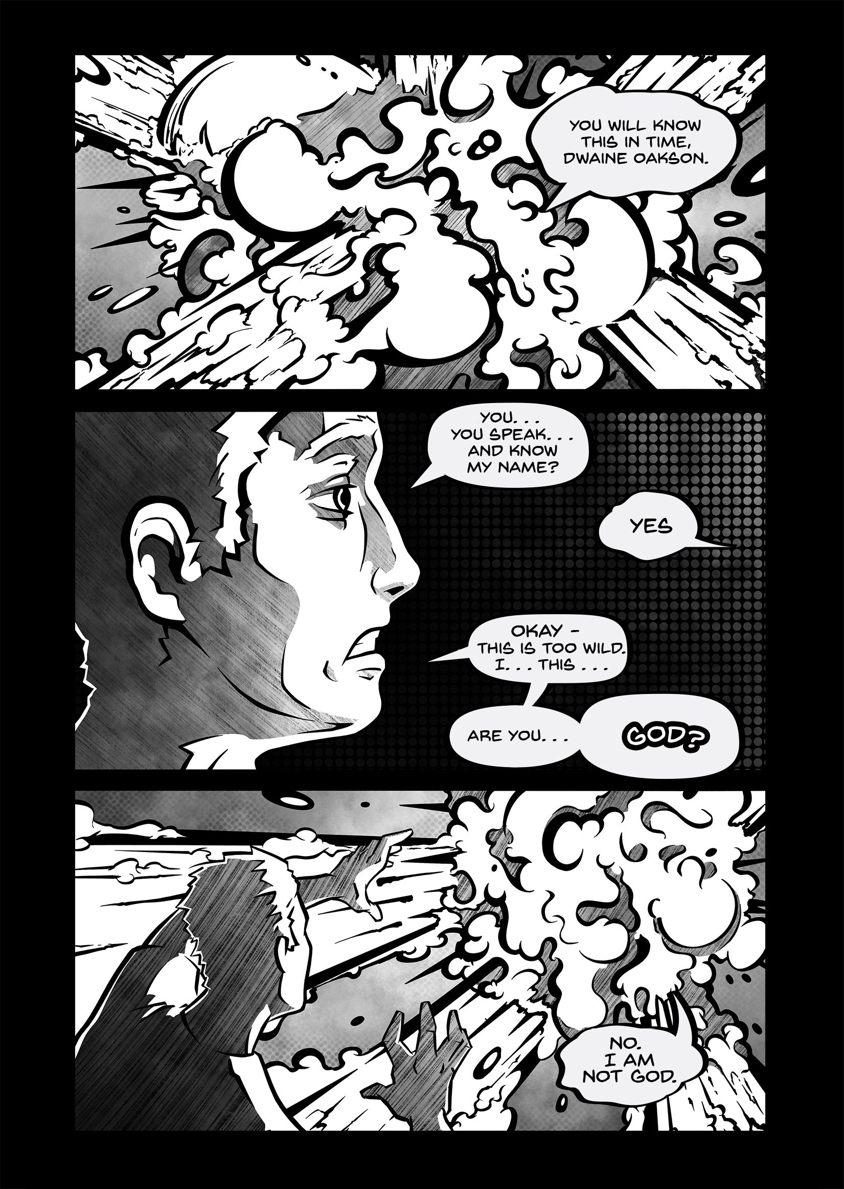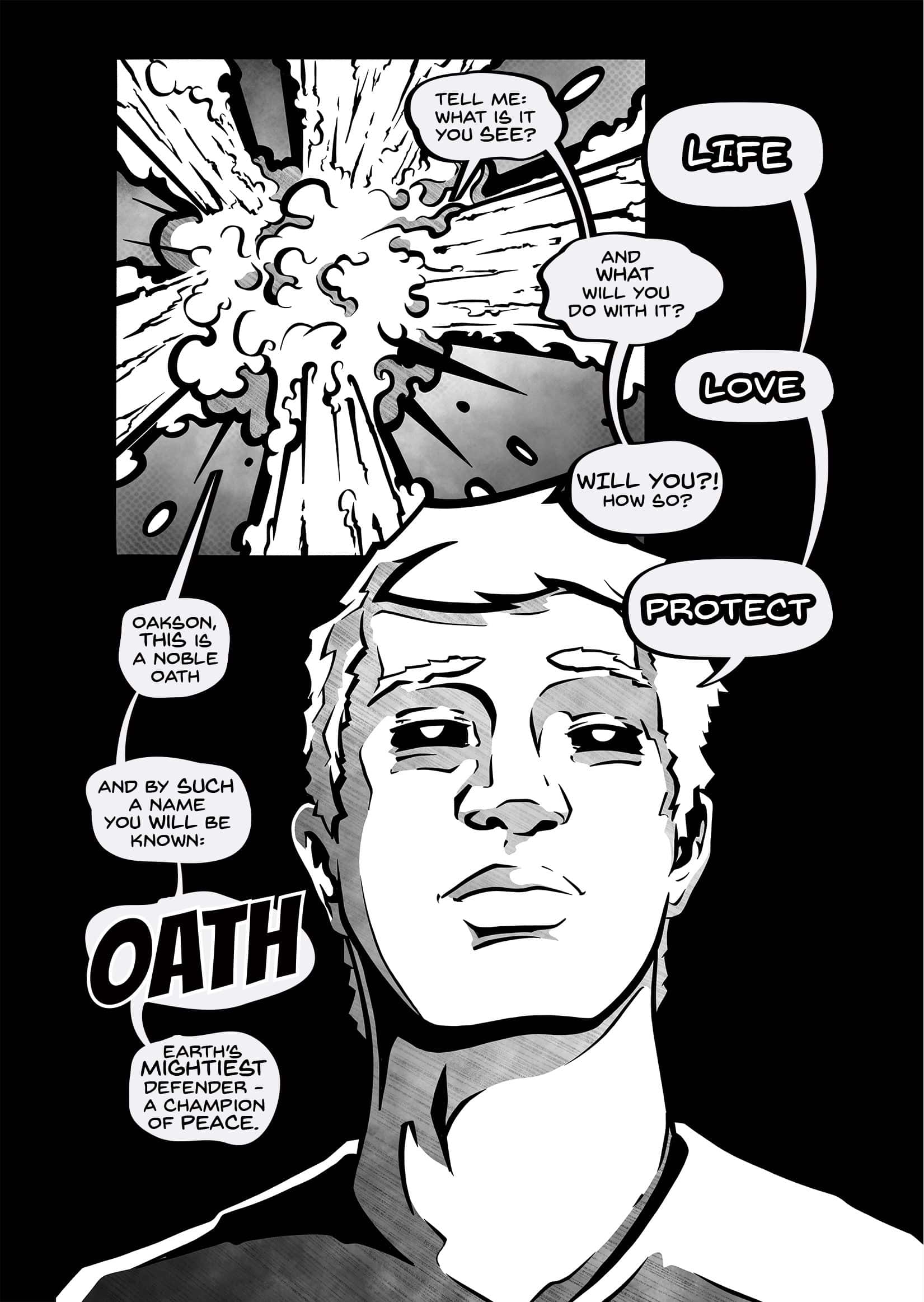 Issue 1 – The Beginning: After a violent encounter tests his courage, Dwaine Oakson discovers his spirit of heroism. Then, a shocking twist sets him on the path to become Oath.